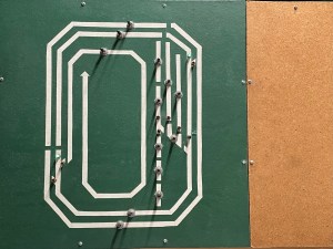 This is a picture of the control panel for my HO layout 1980 – present. It is a freelance plan not following any particular prototype. From this layout there are elements I can salvage and put toward building a new layout that follows the PRR prototype I have chosen. The arrow on the control plan is supposed to point to the upper-level town that would have provided point to point operation. That town would have been controlled by another panel, the blank panel to the right. There was a concept of staging in that the mainline tracks in the upper left were hidden in a tunnel and a mainline passenger would park on the outside track and a mainline freight would park on the inside track.